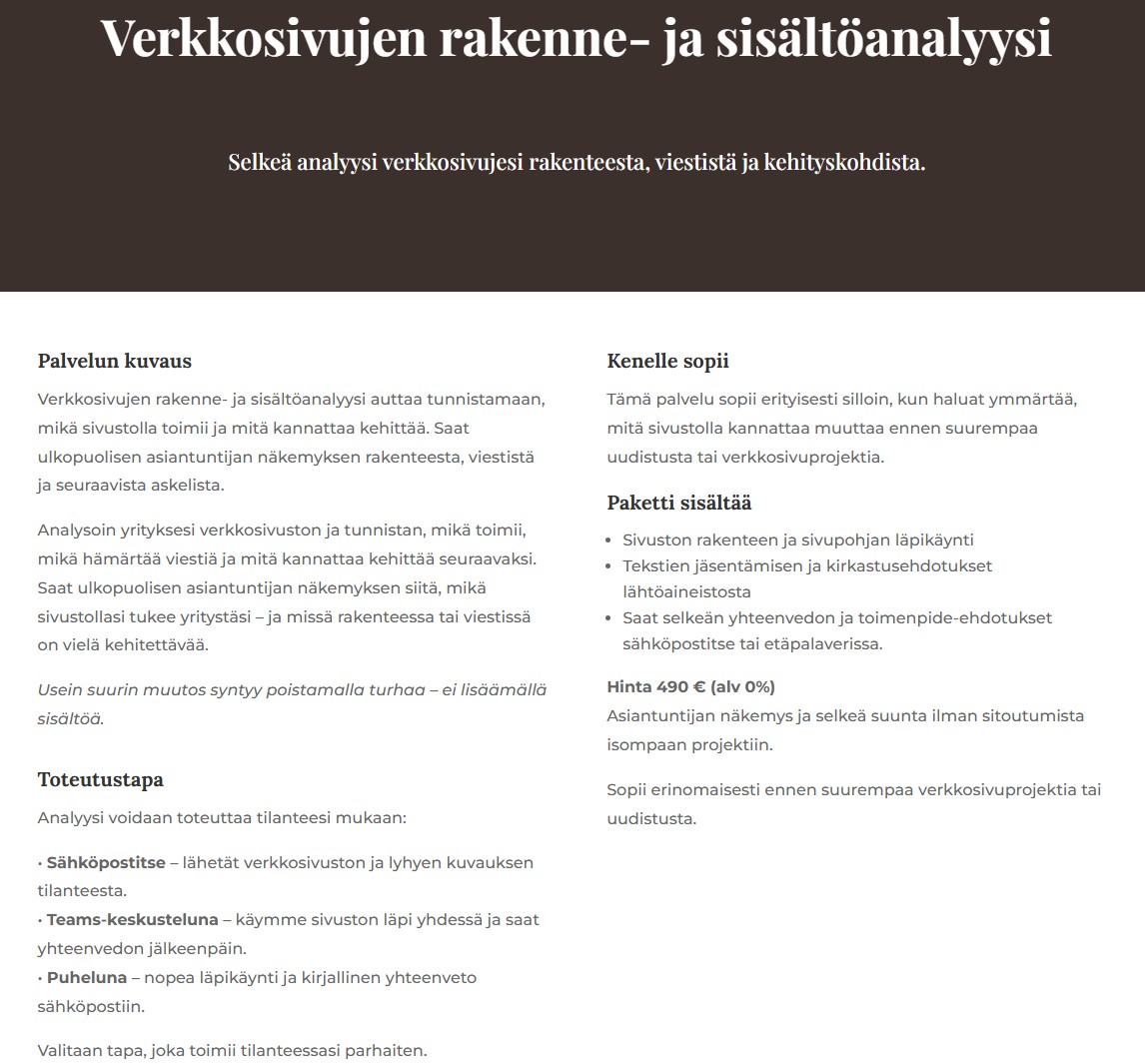 Tyypillisiä töitäni ovat: verkkosivujen analyysi, rakenteen ja sisällön selkeyttäminen sekä WordPress-sivustojen suunnittelu ja kehittäminen.
